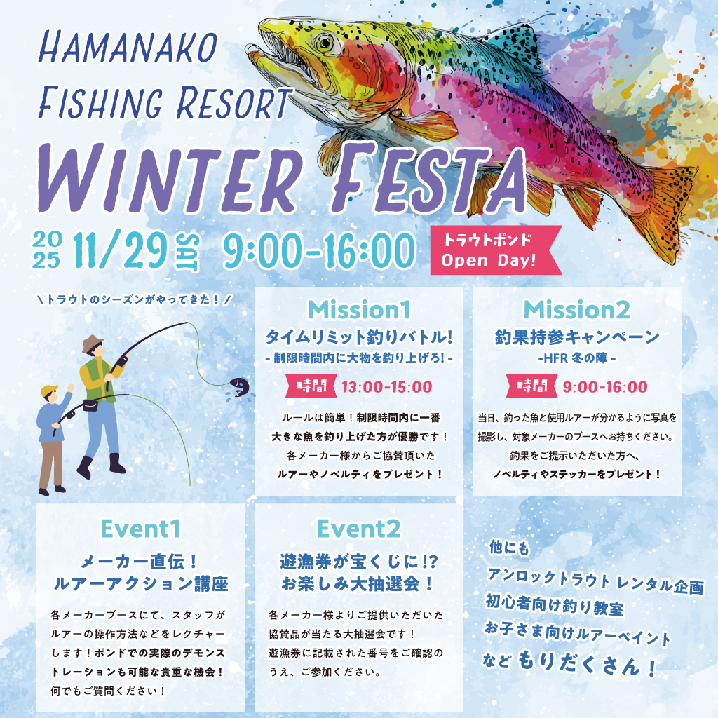暑すぎる夏も終わり、冷え込む日も増えてまいりました今日このごろ。そう…トラウトシーズンの到来です!11月29日(土)は浜名湖フィッシングリゾートでWinter Festaを開催します!